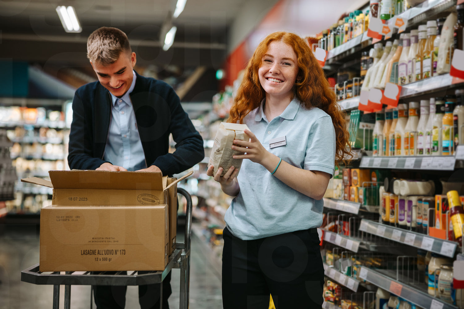 Young worker restocking the shelves with a colleague in the supermarket. Two grocery store employees working together.