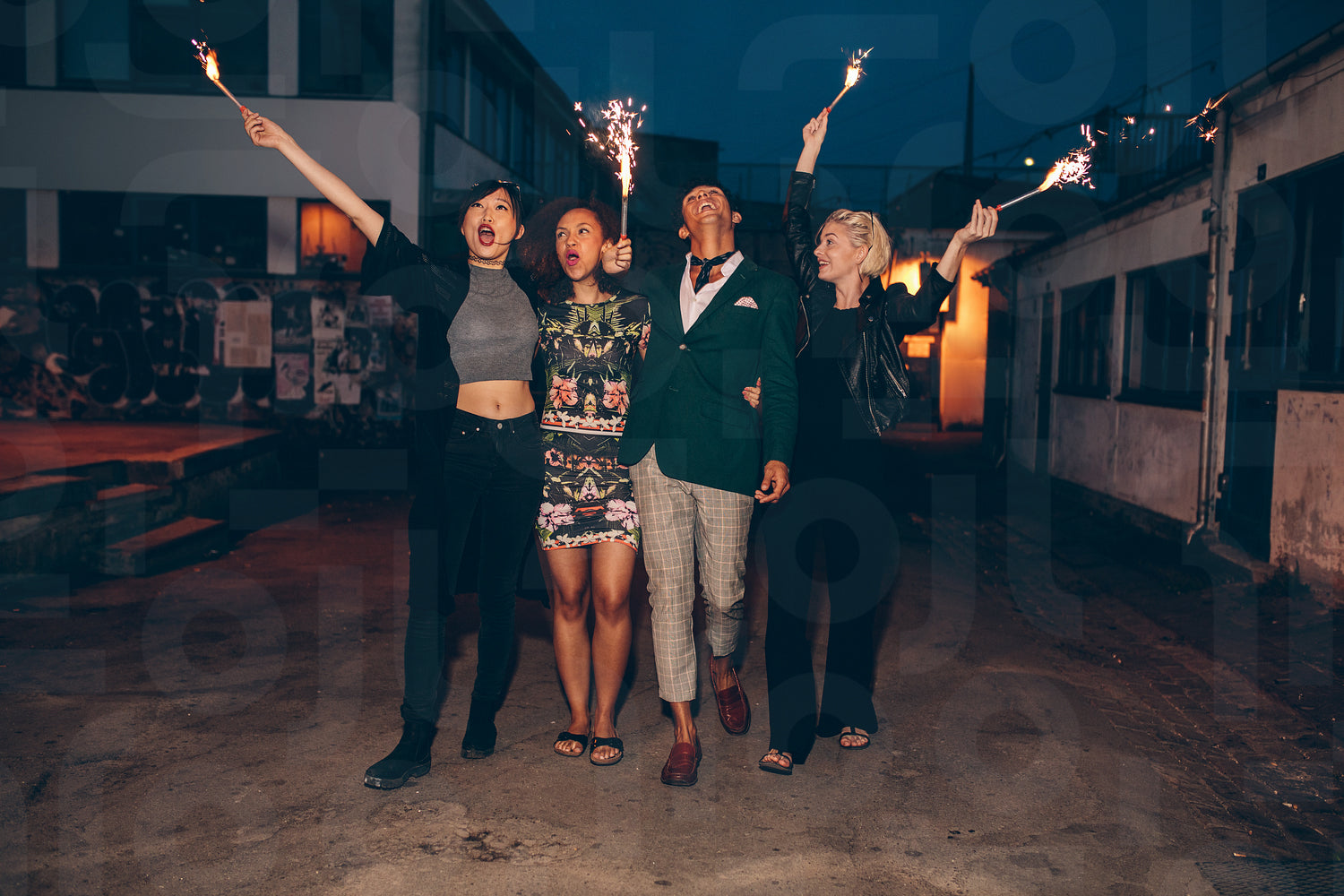 Group of friends enjoying out with sparklers on city street. Young men and women enjoying new years eve on road with fireworks.