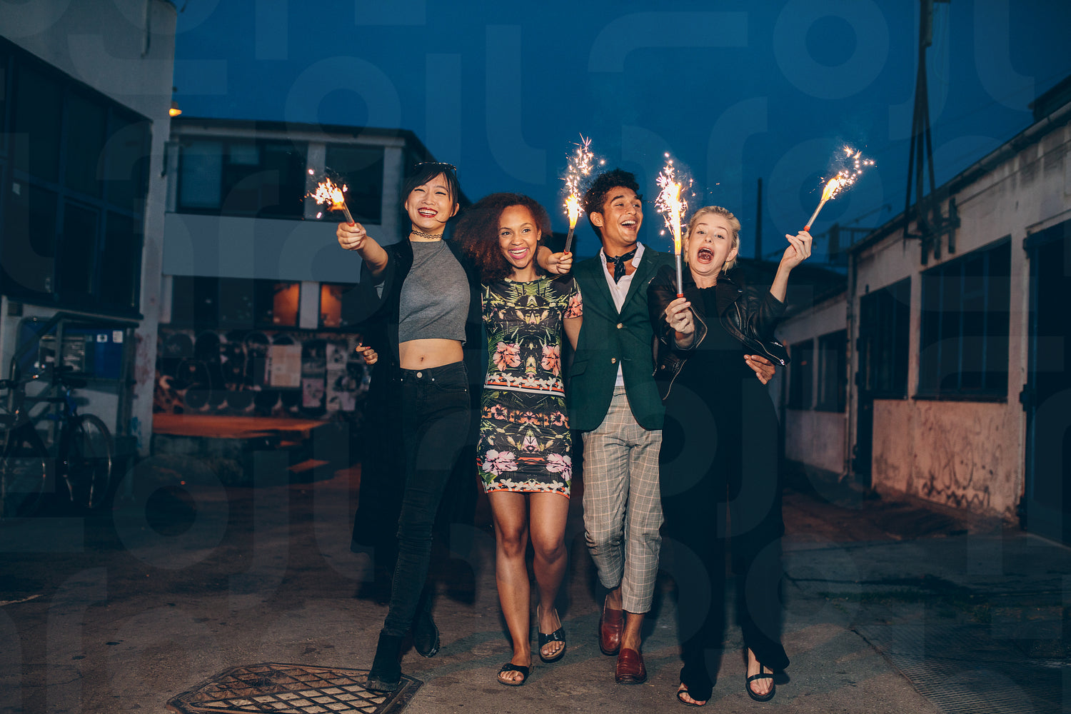 Full length shot of young friends out on city street at night with fireworks celebrating new years eve. Group of friends walking with sparklers on road in evening.