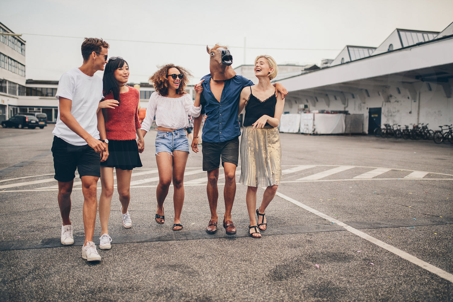 Full length shot of young friends walking together on the street. Multiracial group of young people enjoying outdoors.