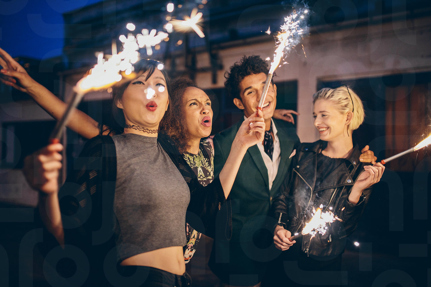 Group of friends enjoying out with sparklers on city street. Young people enjoying new years eve with fireworks.