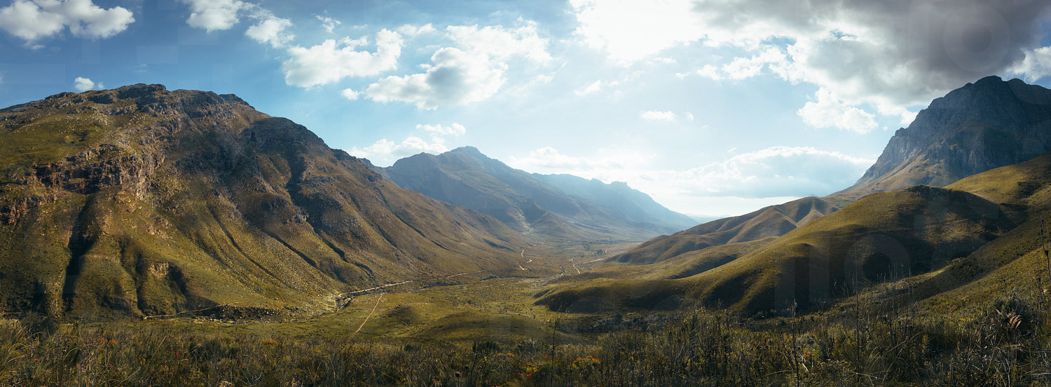 Panoramic view of scenic mountains and valley in Jonkershoek nature reserve. Mountain landscape with cloudy sky.