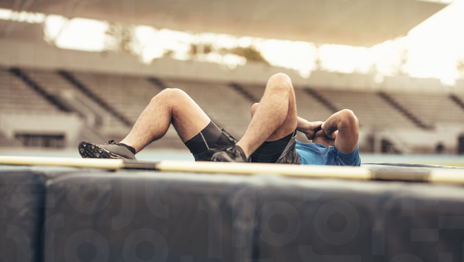 Athlete lying on the high jump landing mat