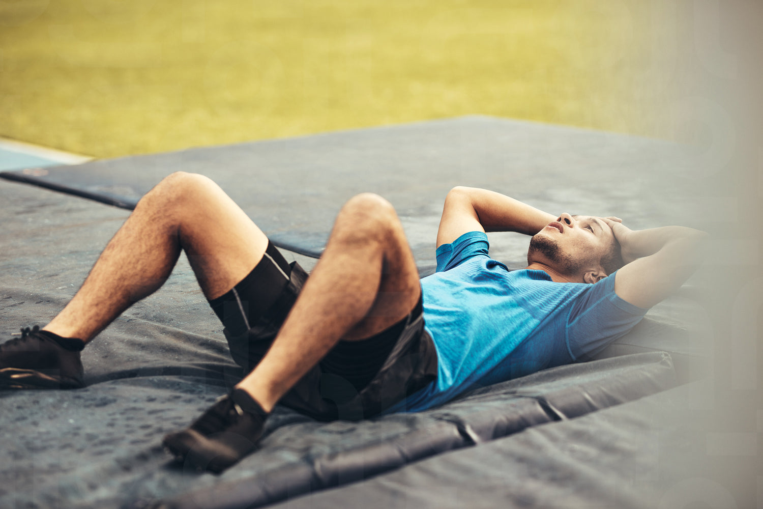 Athlete lying on high jump landing mat looking tired. Athlete holding his hands to his head lying on landing mat after a high jump.