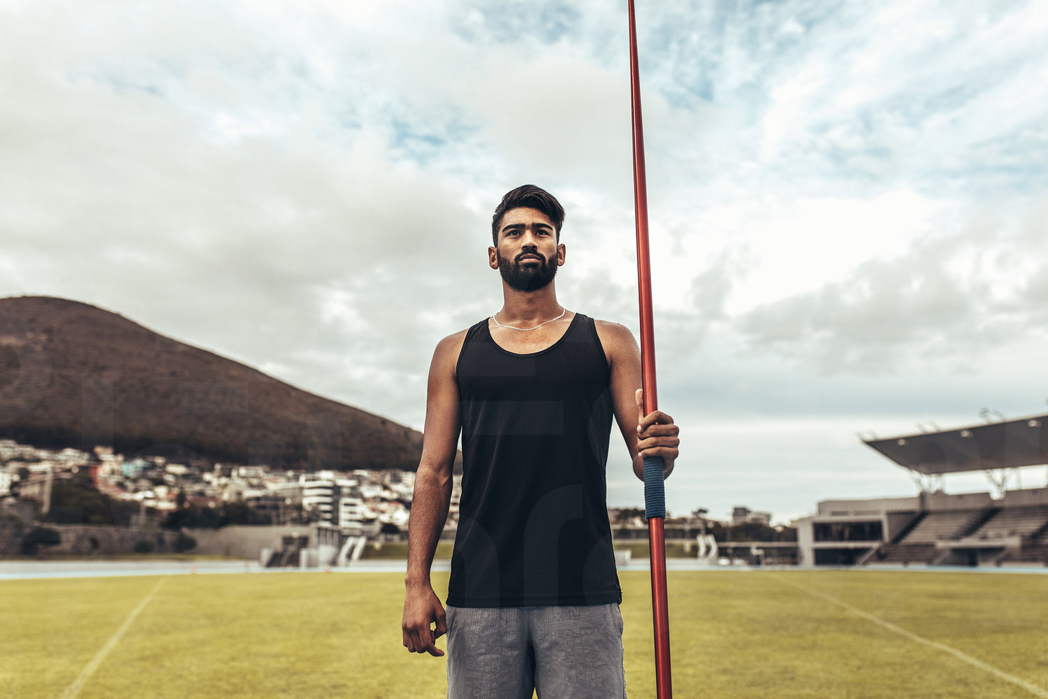 Athlete standing in a track and field stadium holding a javelin. Athlete training in javelin throw standing in a ground.