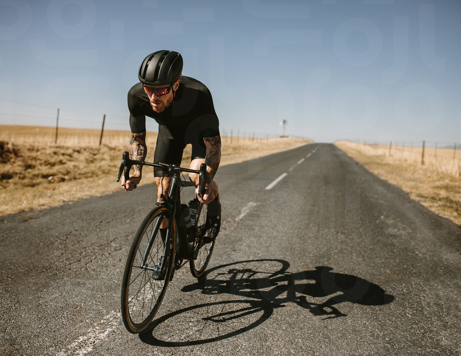 Racer riding a bicycle on the empty road. Male athlete riding a bike on asphalt road in countryside.