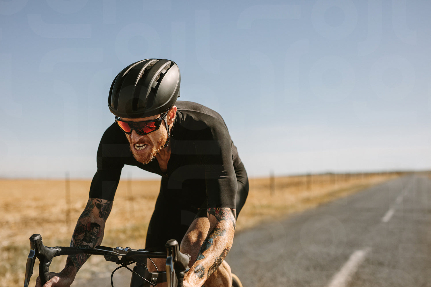 Athlete riding bike along empty road