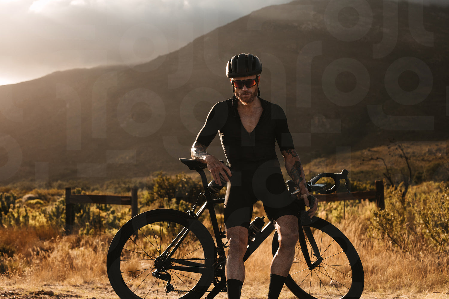 Portrait of male bicycle rider taking a break on country road. Male cyclist taking rest outdoors on countryside road.