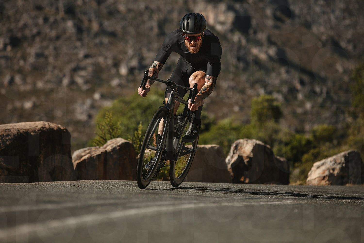 Professional cyclist riding bicycle through curvy mountain road. Fit sportsman cycling outside on hilly road.
