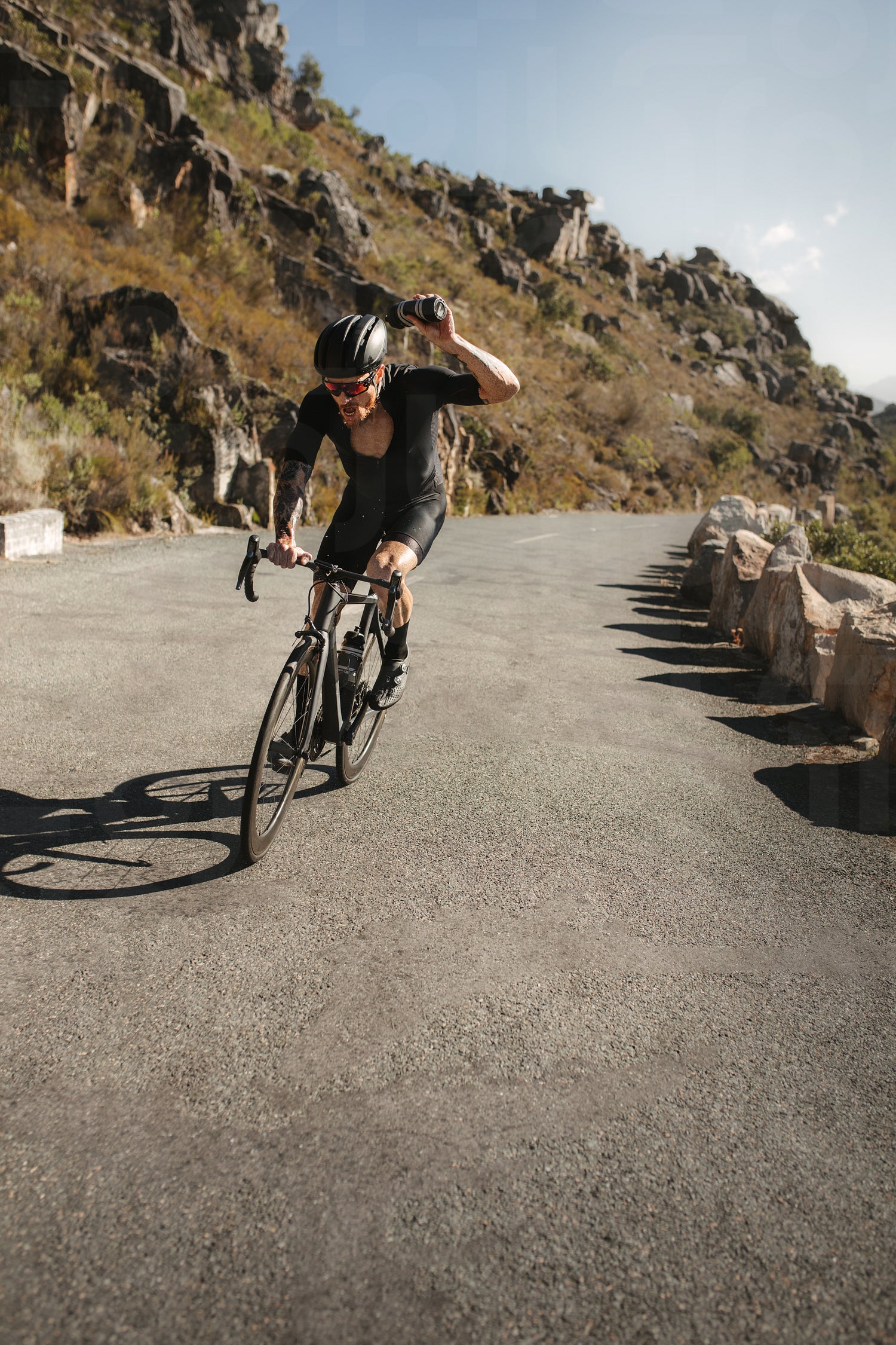 Sportsman pouring water on his head while riding bicycle on mountain road. Male cyclist cools his head while cycling on a summer day.