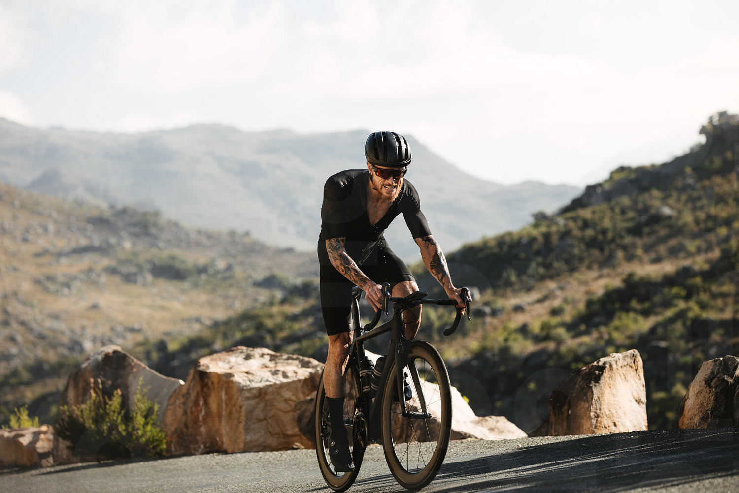 Sportsman cycling road bike on mountain road. Strong cyclist pedals uphill during training.