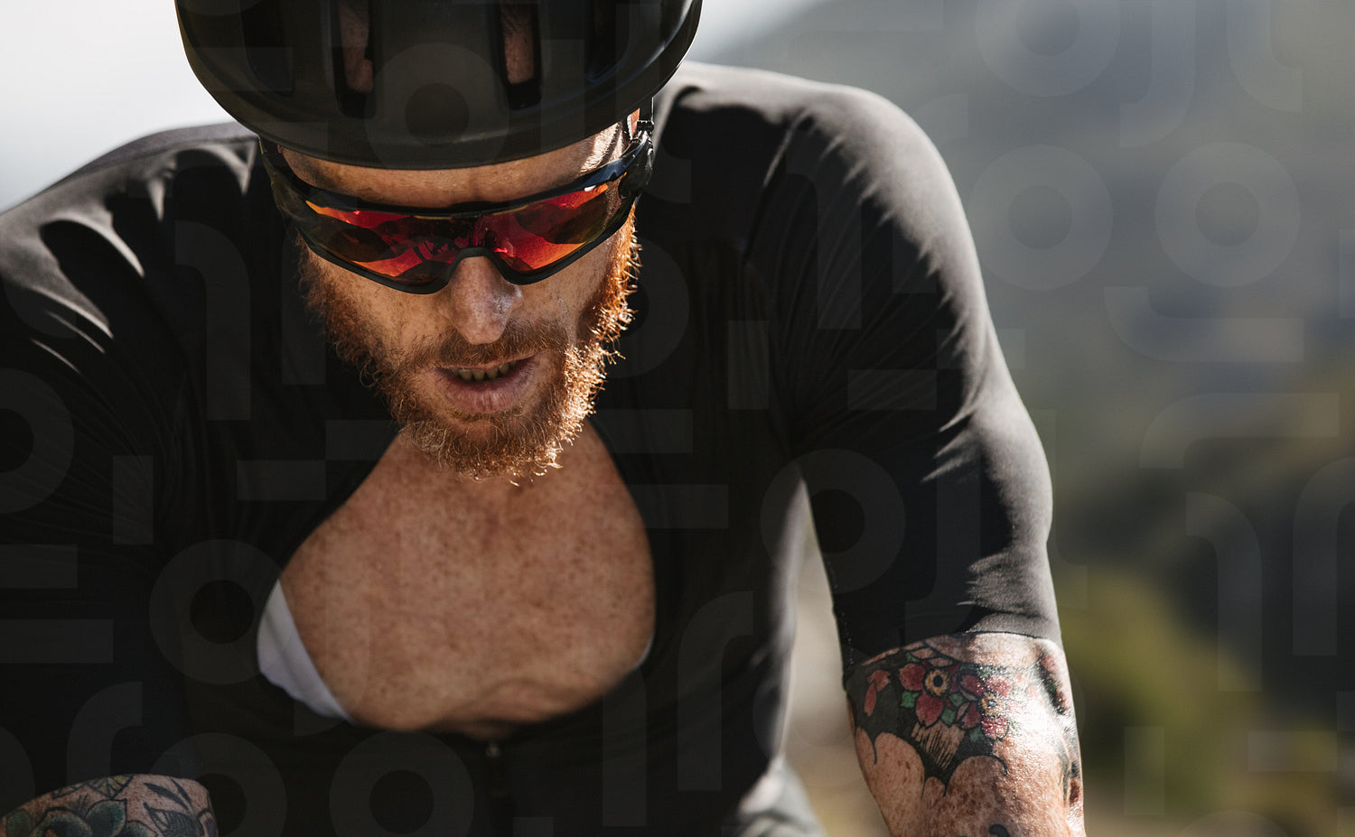Sportsman looking exhausted during cycling training outdoors. Professional cyclist looking tired while training on road bike.