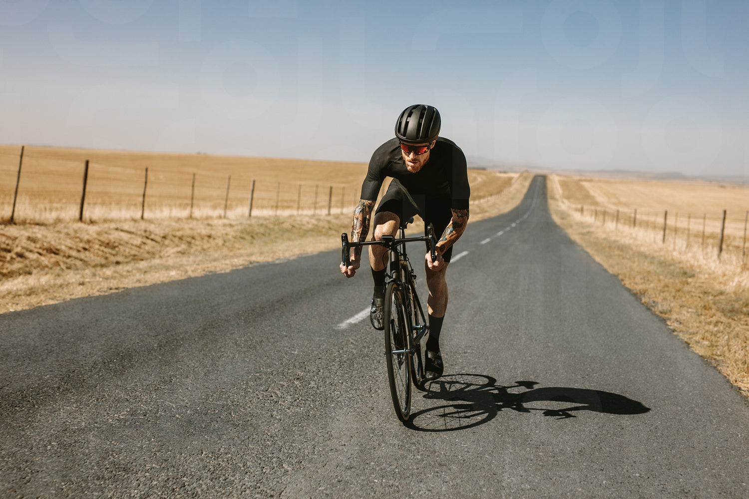 Cyclist cycling on countryside landscape highway. Fit sportsman cycling outside on long road.