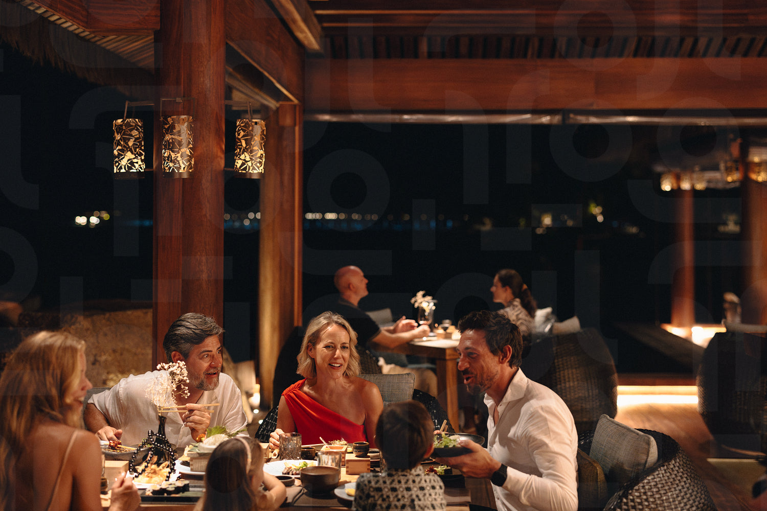 Happy family enjoying a fine dining experience at a coastal resort