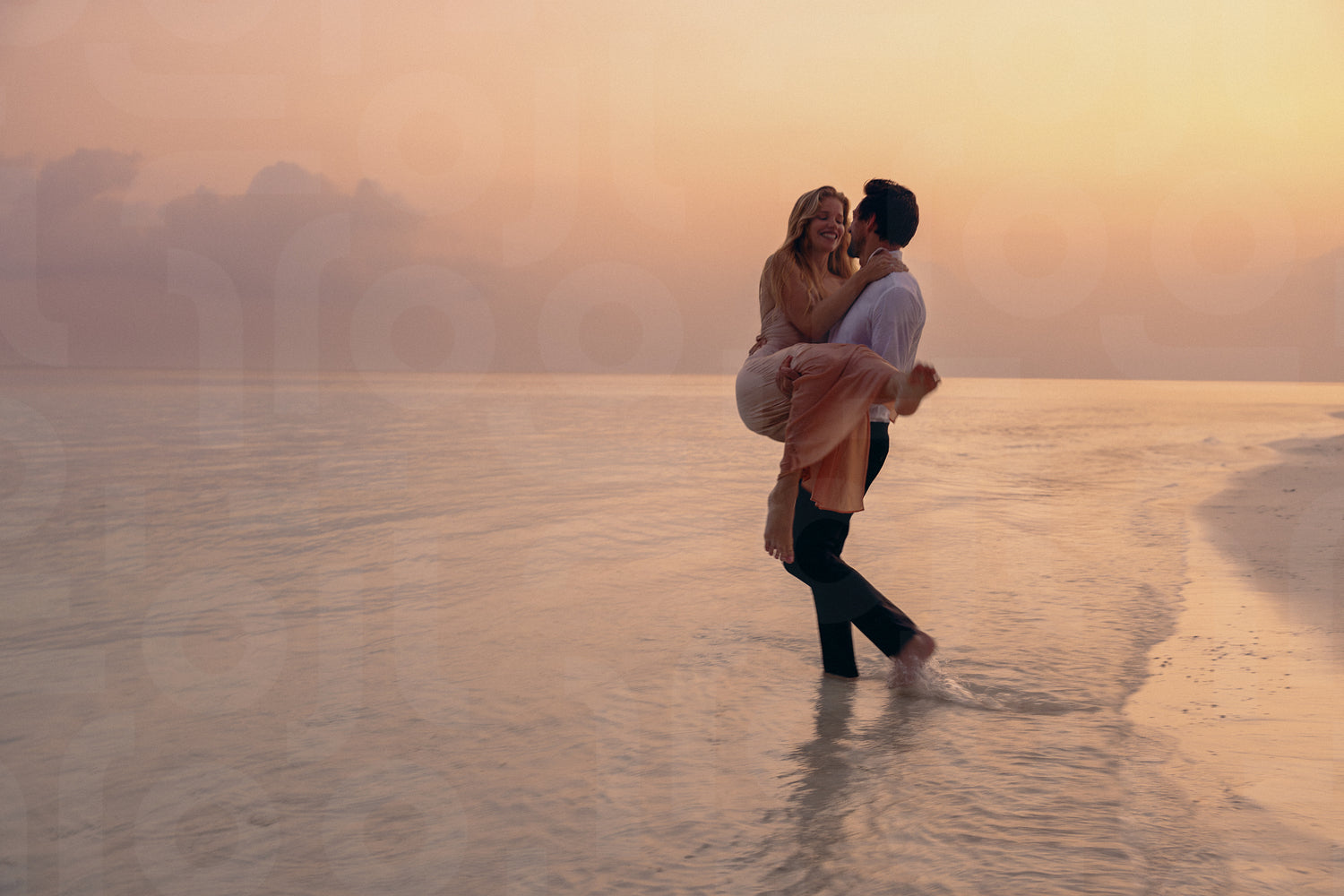 Newlyweds celebrating their elopement on a romantic island at sunset, capturing a moment of joy and love on a serene beach.