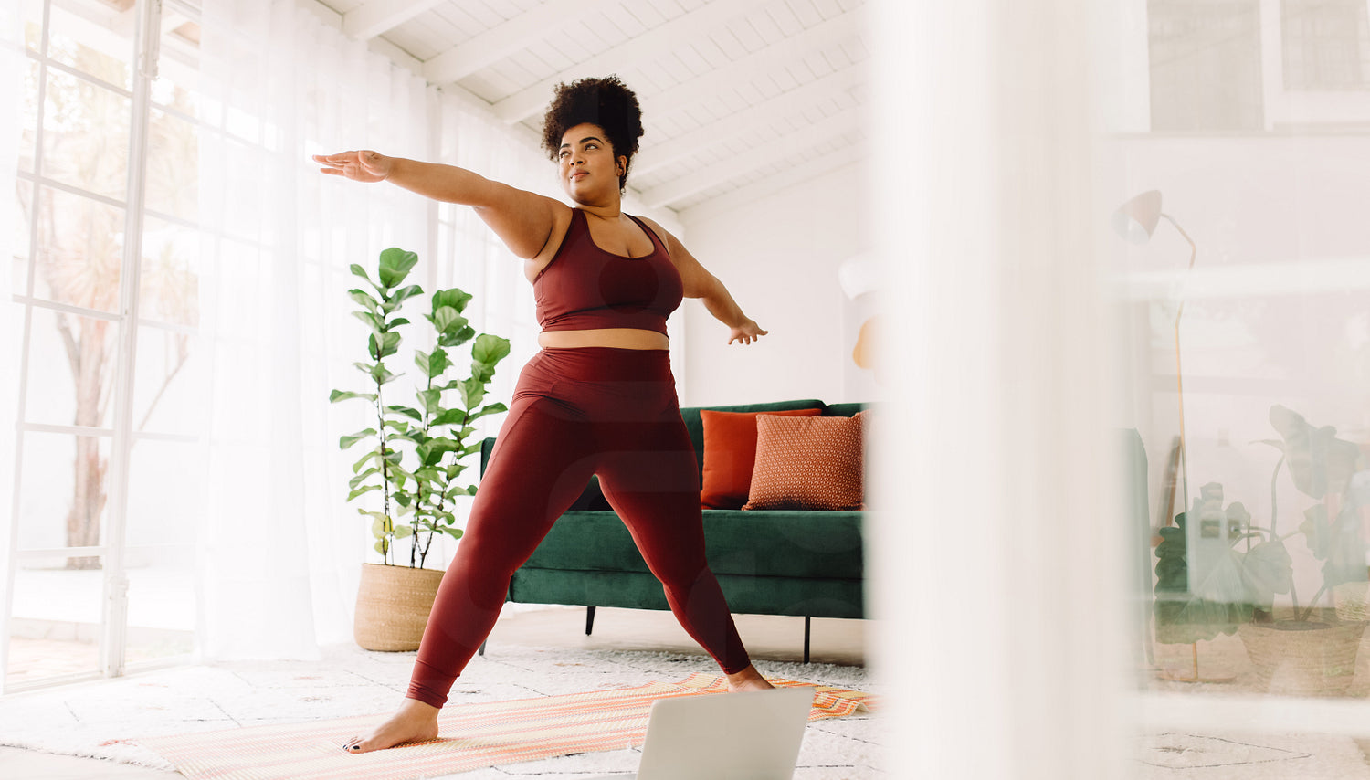 Full length of woman training at home. Healthy female in fitness wear exercising at home.
