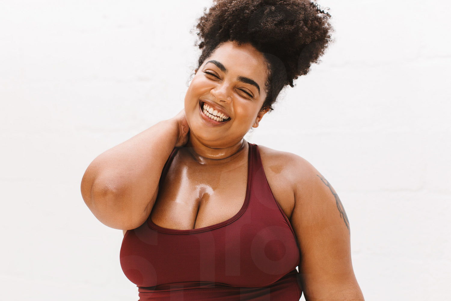 Beautiful fitness female tired after workout. Body positive woman with sweat on body looking happy against white background.