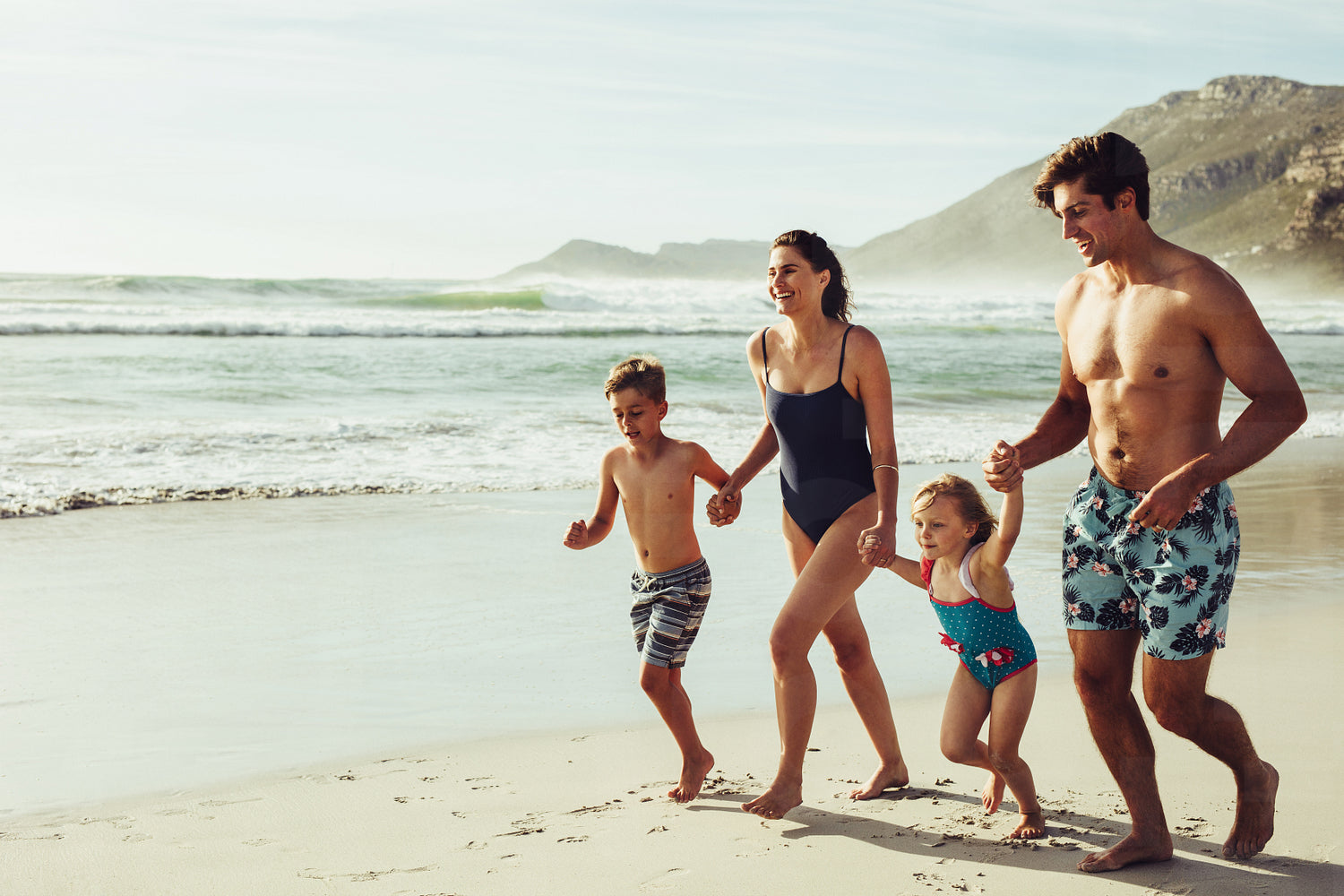Cheerful family running on the beach. Happy mother and father with two children having fun during summer holiday.