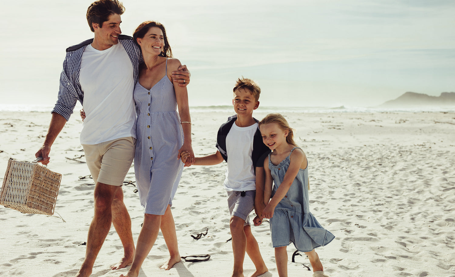 Kids walking with their parent along the beach on summer day. Family of four at beach for a picnic.