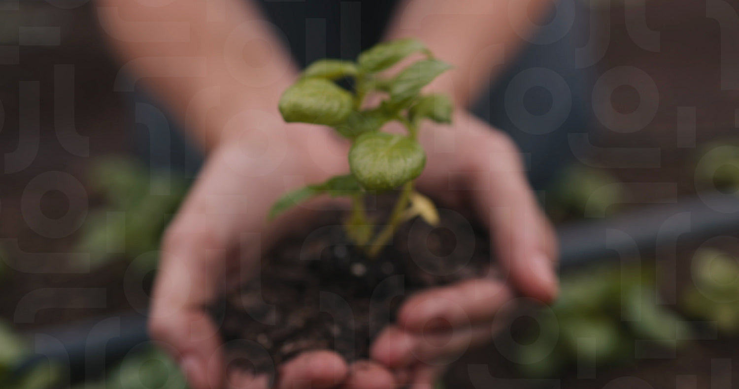 Anonymous female farmer holding a green seedling growing in soil. Unrecognizable organic farmer protecting a growing plant in cupped hands. Farmer caring for her plants in an agricultural field.