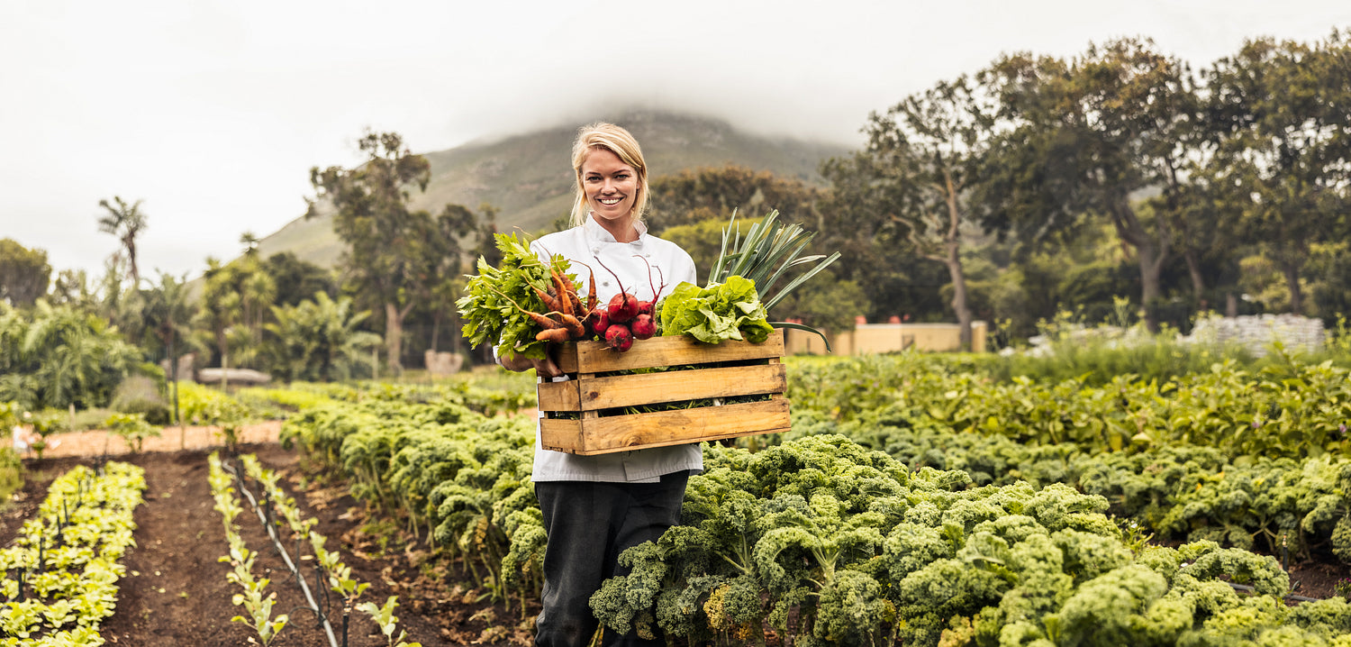 Carrying fresh vegetables from farm to table. Cheerful young female chef smiling at the camera while carrying a crate full of freshly picked vegetables in an agricultural field.