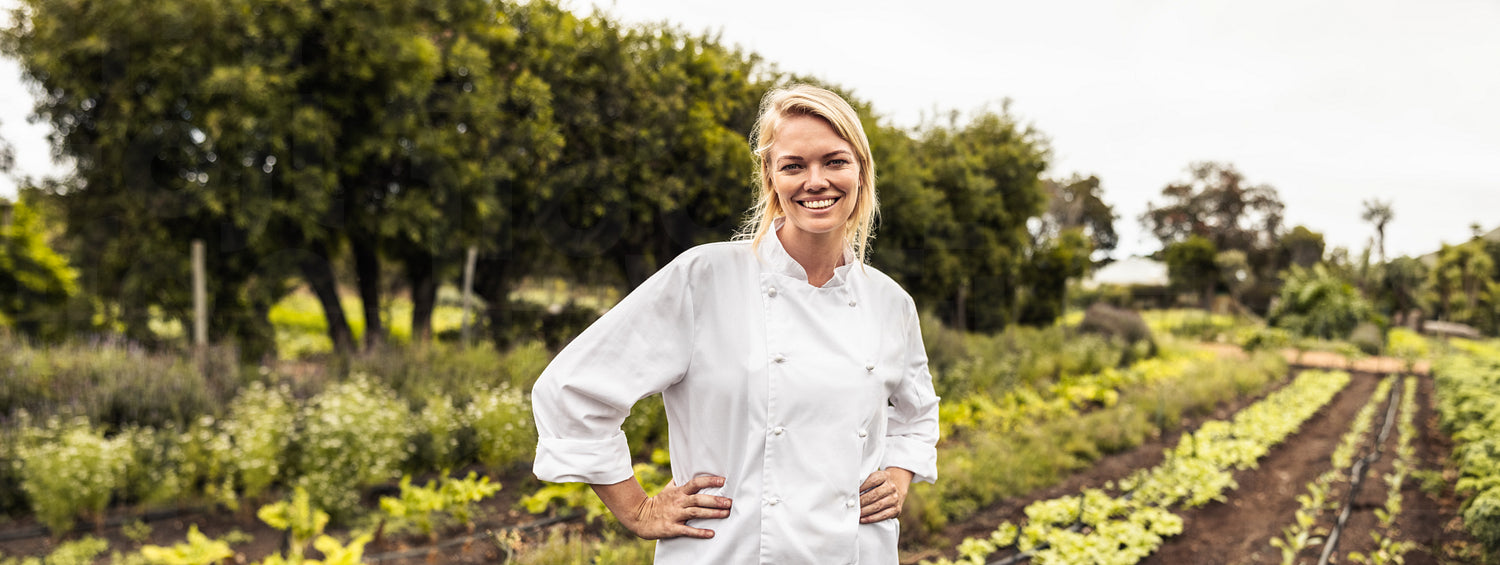 Cheerful young female chef smiling at the camera cheerfully in an agricultural field. Self-sufficient female chef standing with her arms crossed in an organic vegetable farm.