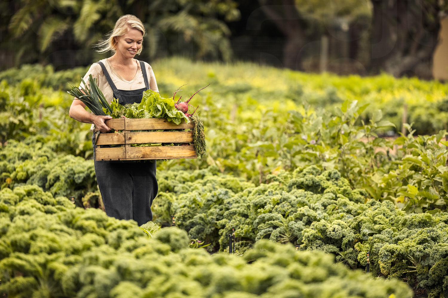 Female vegetable farmer harvesting in her garden. Happy young organic farmer holding a box full of freshly picked produce while walking through her vegetable garden. Successful farmer smiling cheerfully.