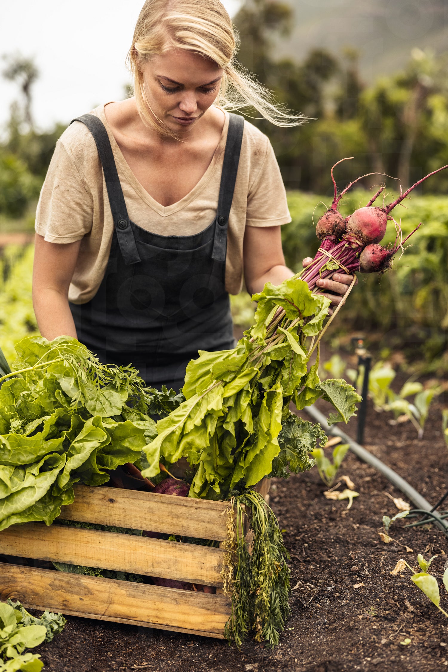 Organic farmer arranging fresh vegetables into a crate on her farm. Young female farmer gathering fresh radish in her vegetable garden. Self-sustainable young woman harvesting in an agricultural field.