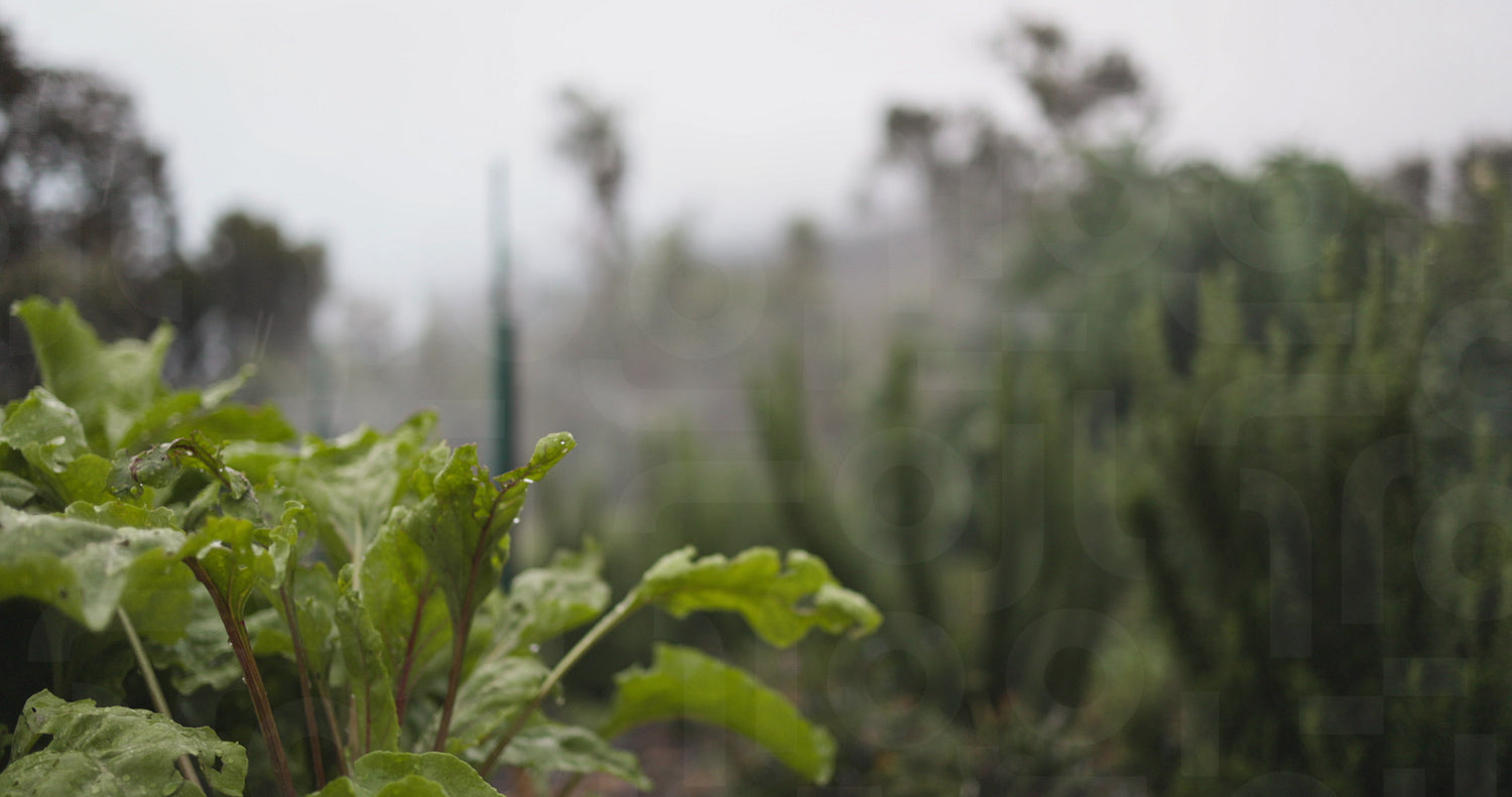 Water sprinklers spraying over the fresh leaves of beetroot crops in an agricultural field. Automatic irrigation system watering green vegetable plants in an organic garden.