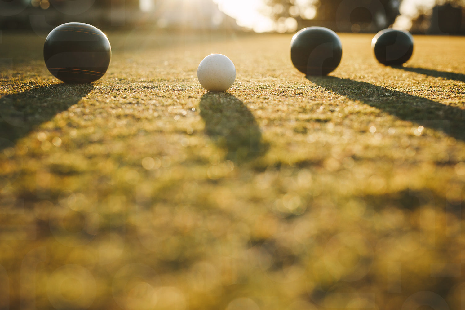 Ground level shot of boules lying near a jack. Three boules and a jack lying on ground with sun in the background.