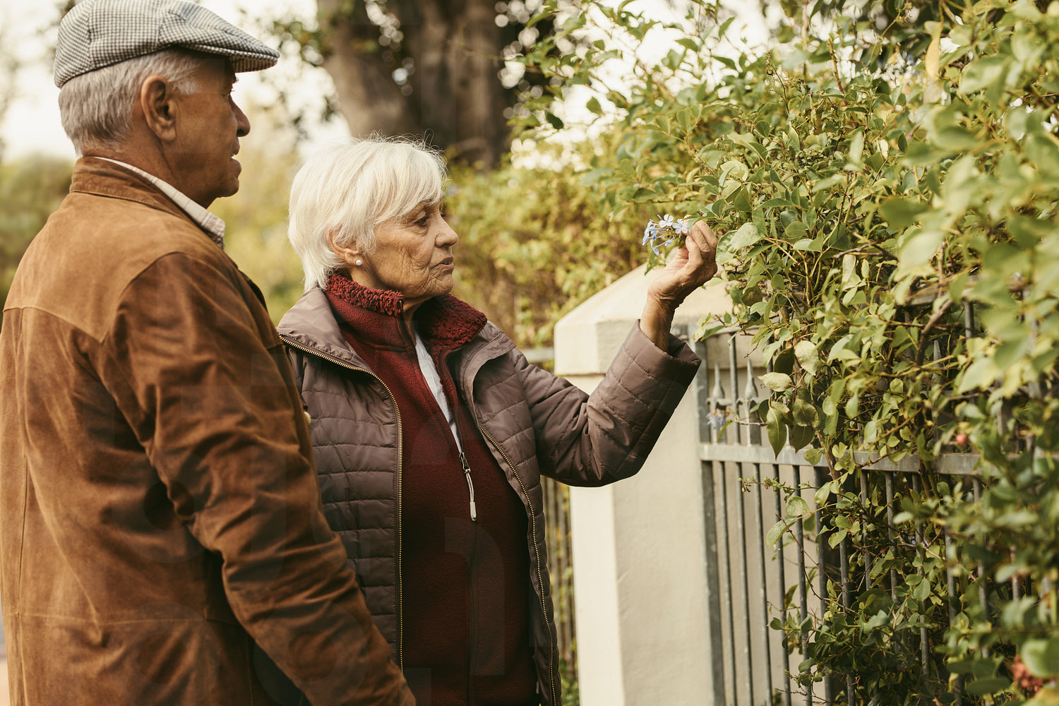 Elderly couple looking at flowers on fence