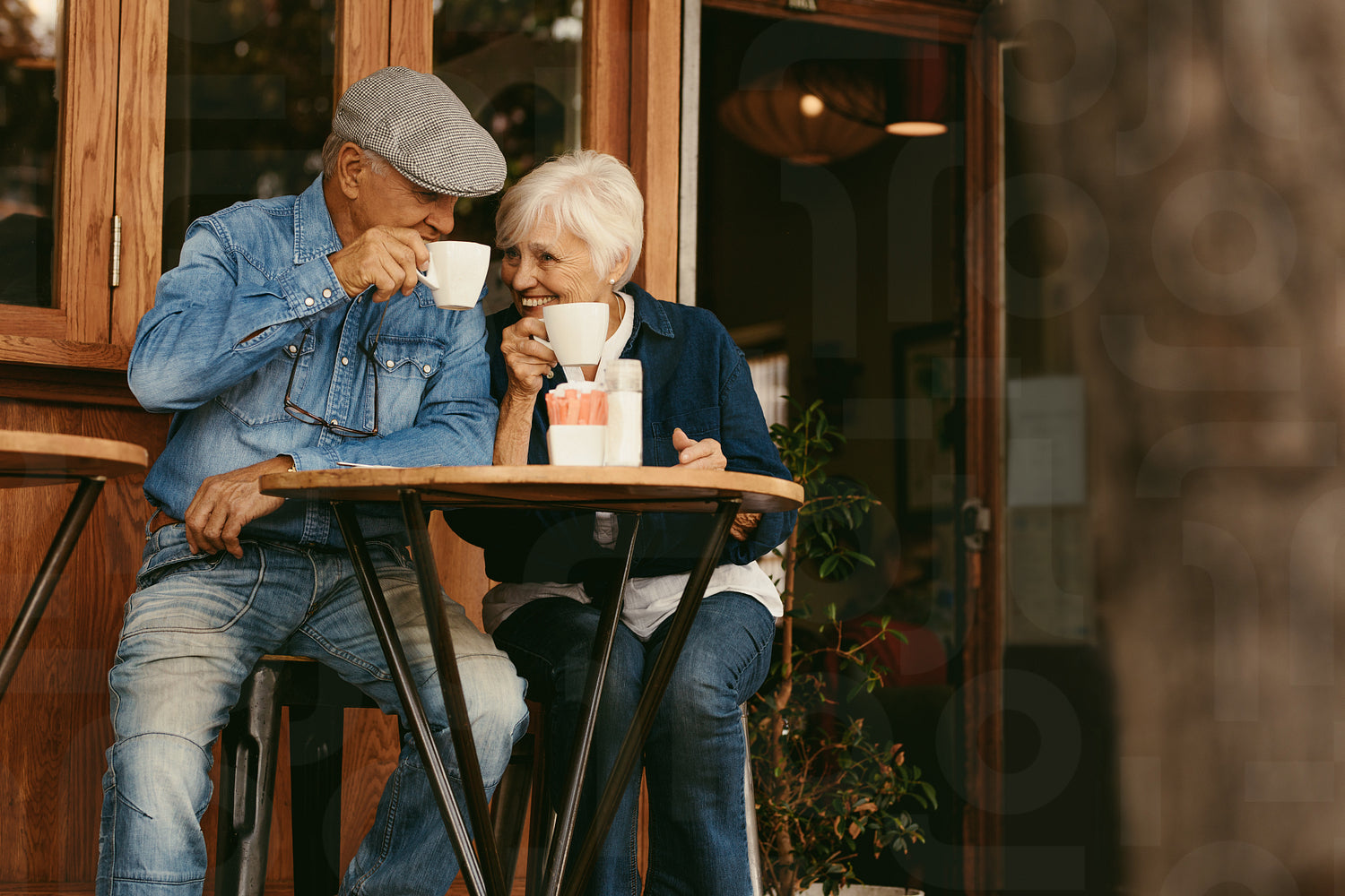 Happy senior couple sitting at coffee shop and talking. Elderly man and woman relaxing at cafe and having coffee.