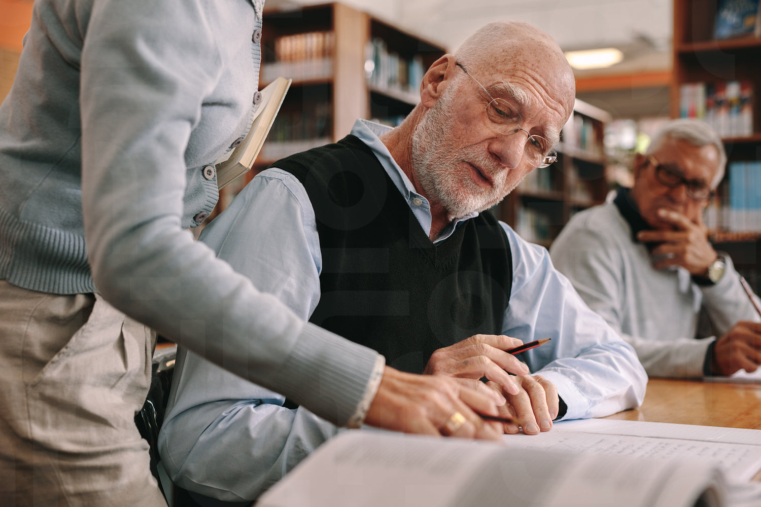 Side view of a lecturer helping a senior man in classroom while another student looks on. Lecturer explaining the concepts from the book of an elderly student in classroom.