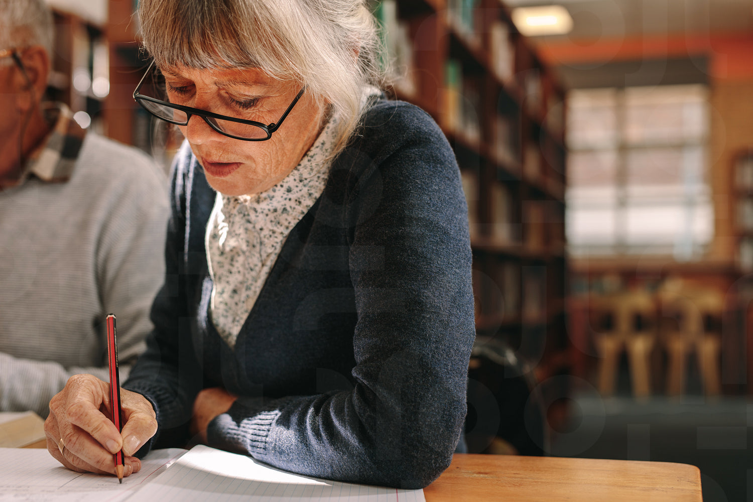 Senior woman sitting in classroom and making notes. Seniors learning sitting in a university classroom.