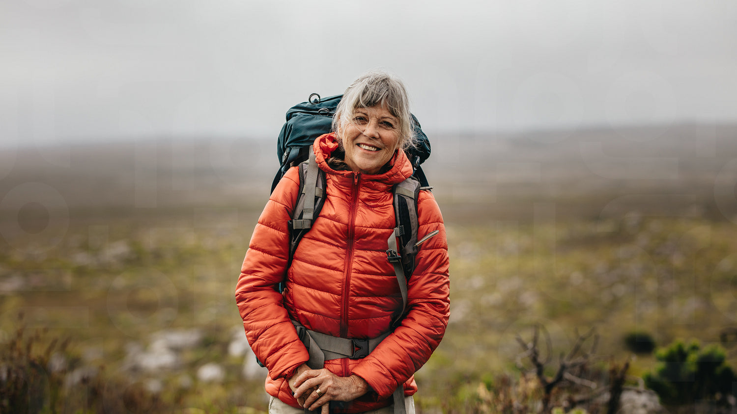 Portrait of a smiling female hiker standing on top of a hill on a winter day. Senior woman wearing jacket and backpack hiking on a hill.