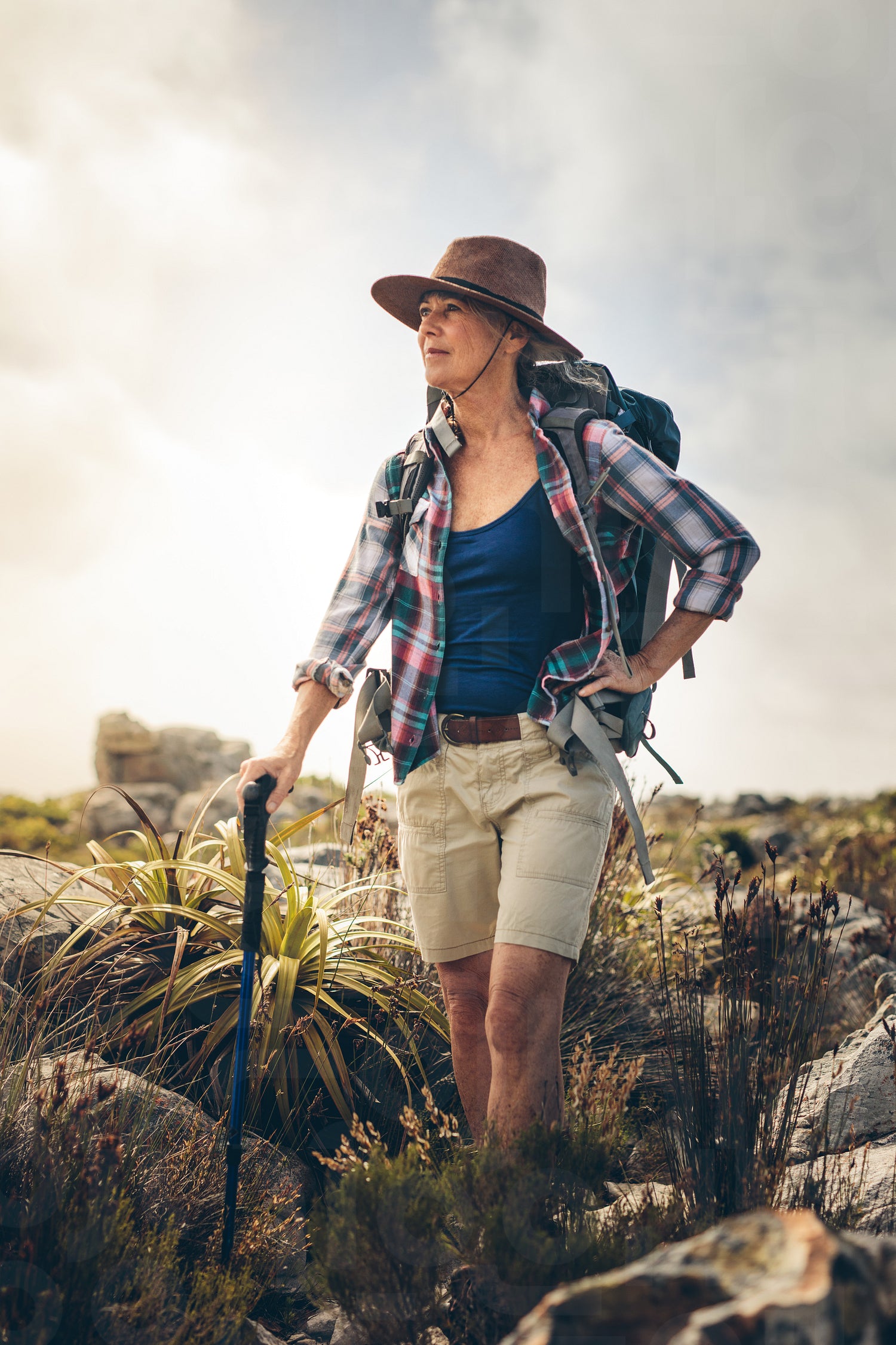 Senior woman on a hiking trip standing on a hill and looking away. Woman wearing hat and backpack trekking a rocky path holding a hiking pole.
