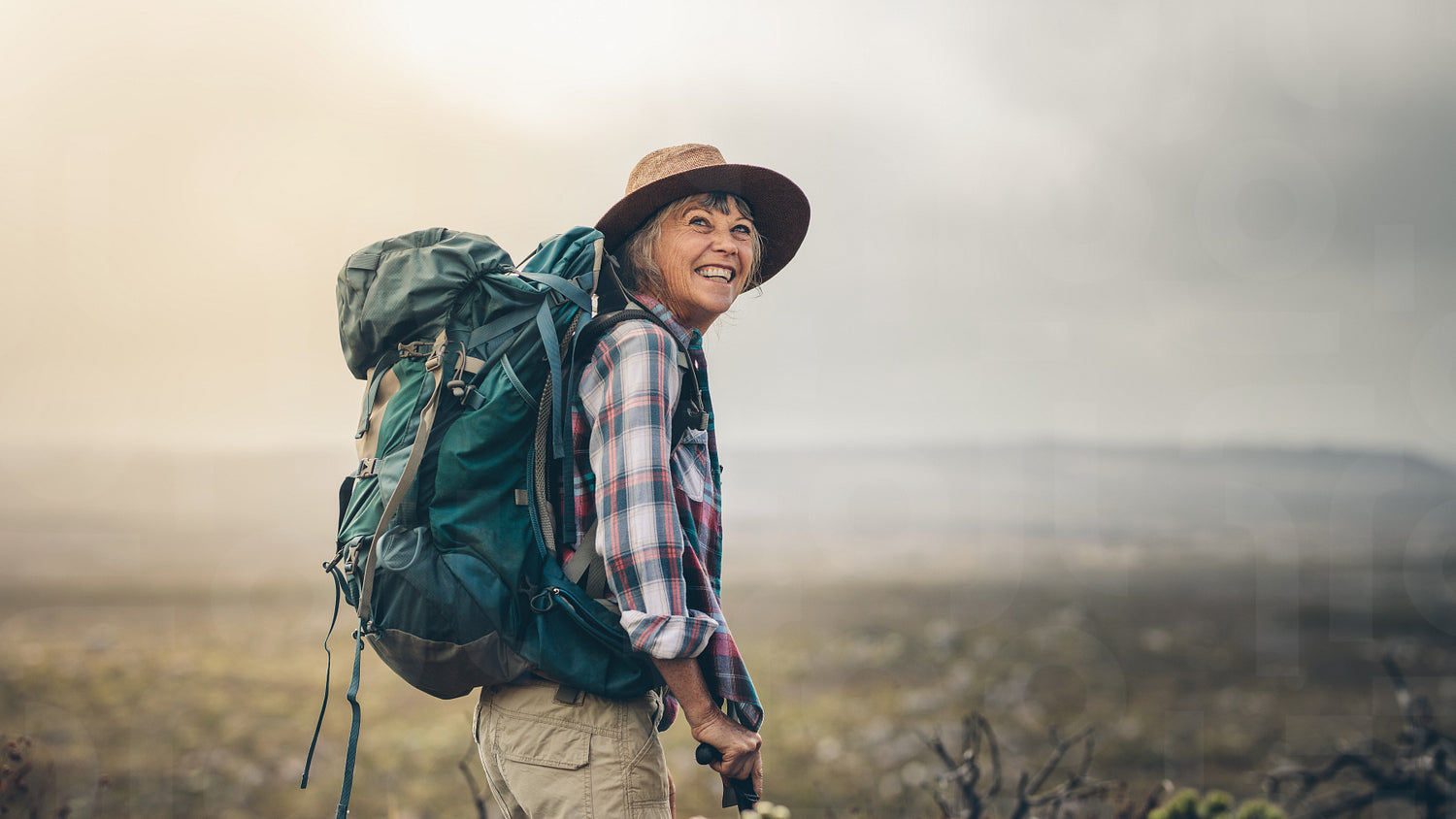 Side view of a senior woman carrying backpack standing on a hill during trekking. Smiling senior woman looking excited during a hiking campaign.