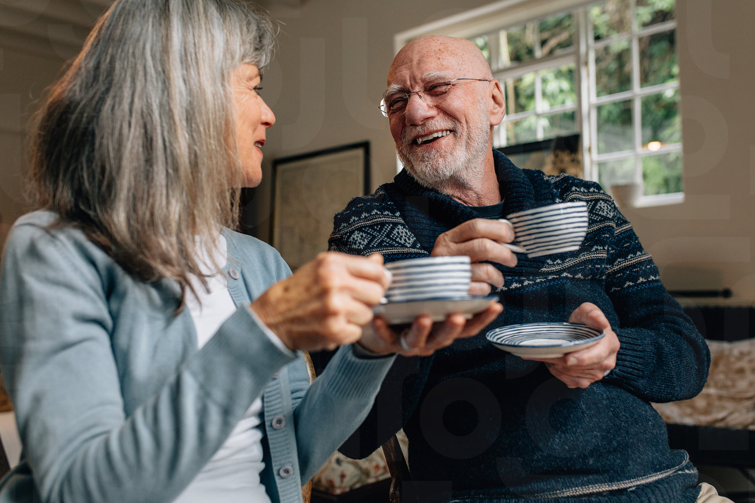Old man and woman spending time together talking and drinking coffee. Senior couple sitting together at home holding coffee cups looking at each other.