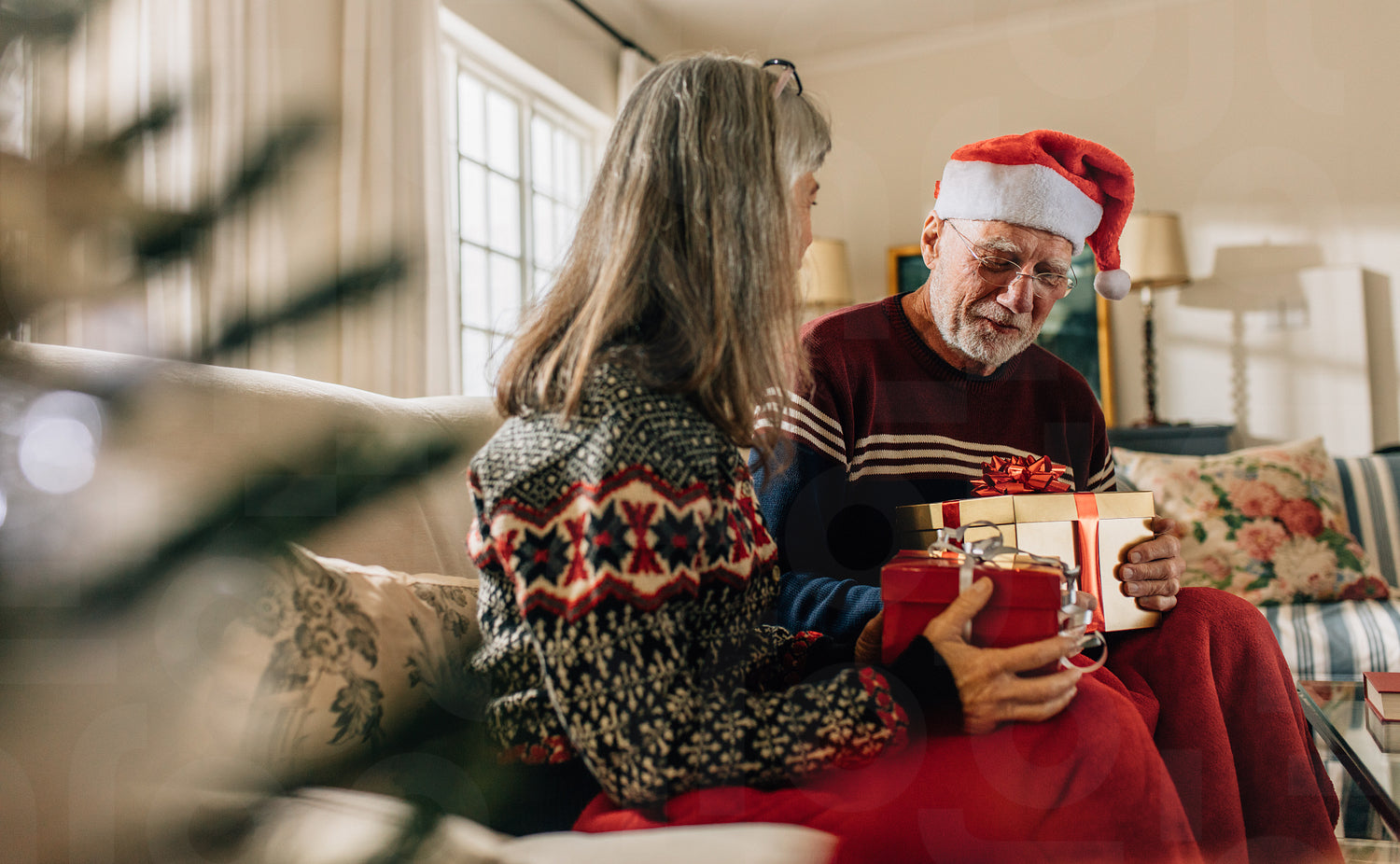 Old couple celebrating christmas at home and exchanging presents. Senior man in santa cap sitting on couch at home with wife holding christmas gifts.