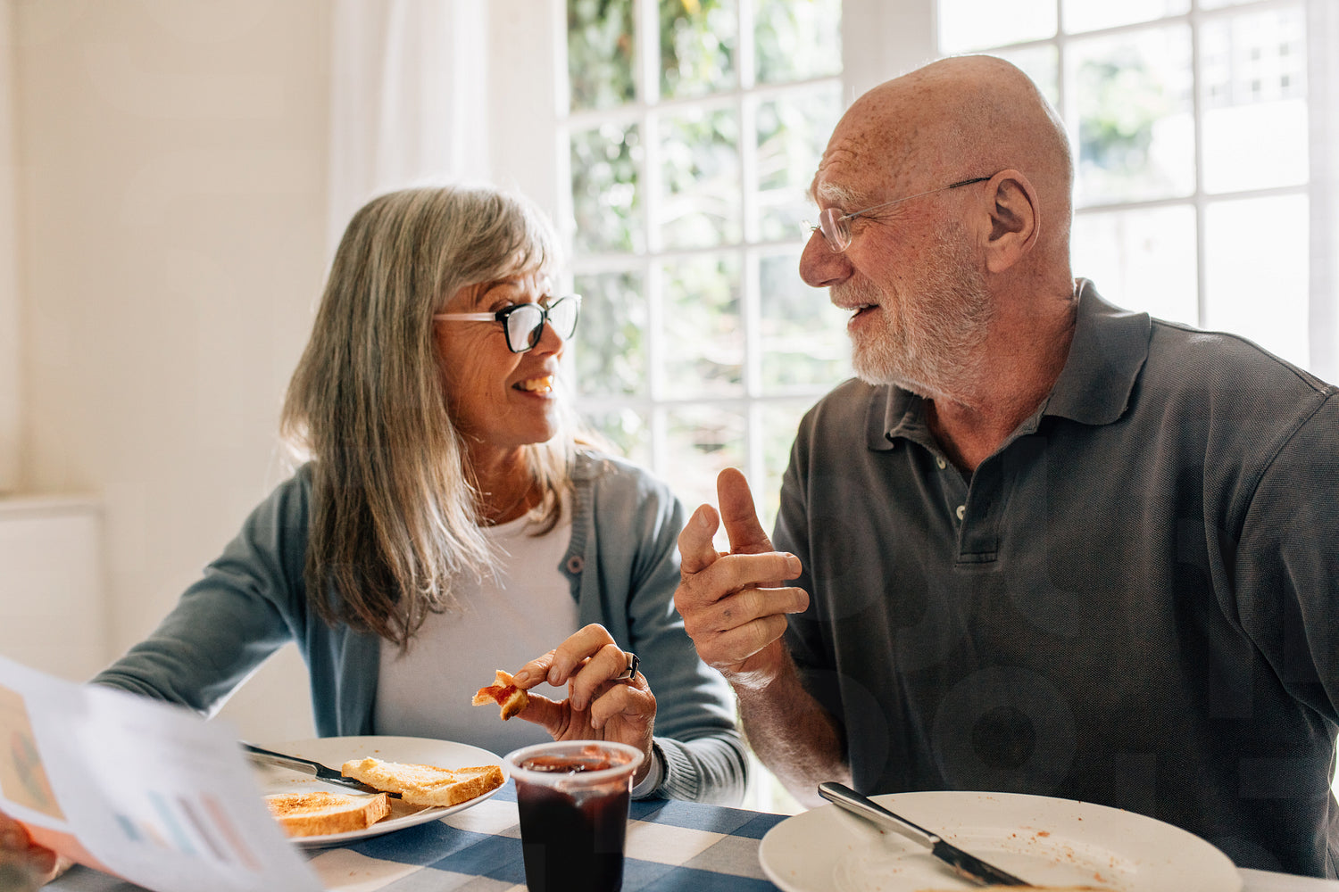 Senior man and woman talking to each other while eating breakfast at home. Woman holding a paper discussing with her husband at the breakfast table.