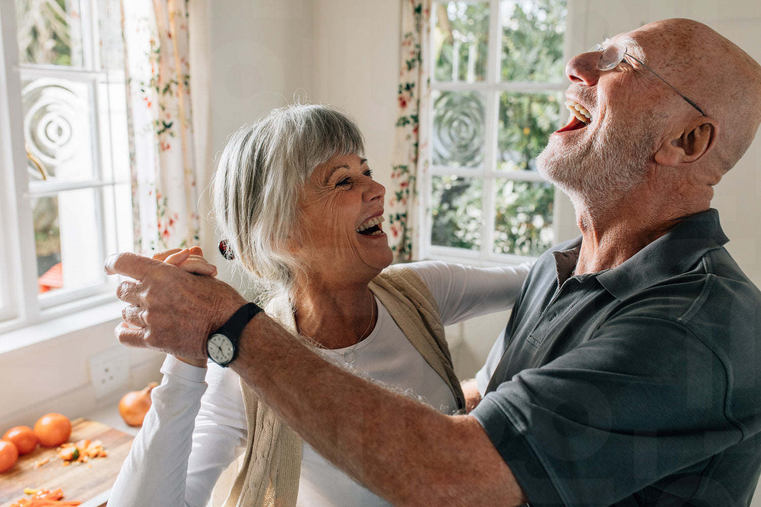 Senior man and woman dancing in joy at home. Happy senior couple having fun doing a ballroom dance at home.
