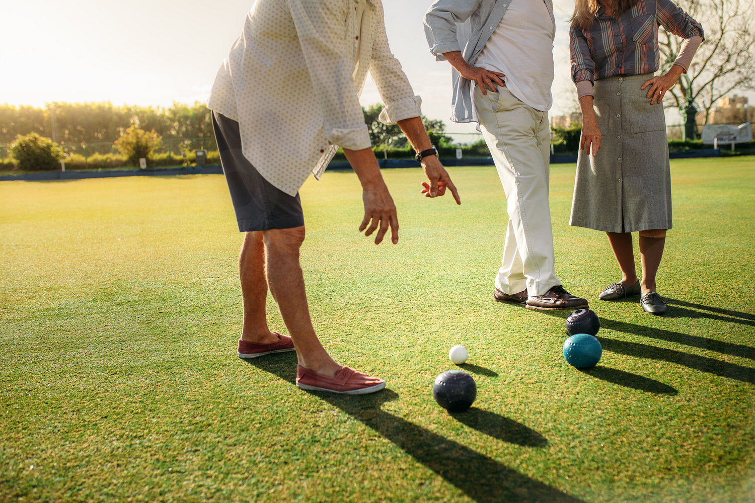 Cropped shot of a group of friends playing boules in a park. People talking about position of boules pointing at the boules on the ground.