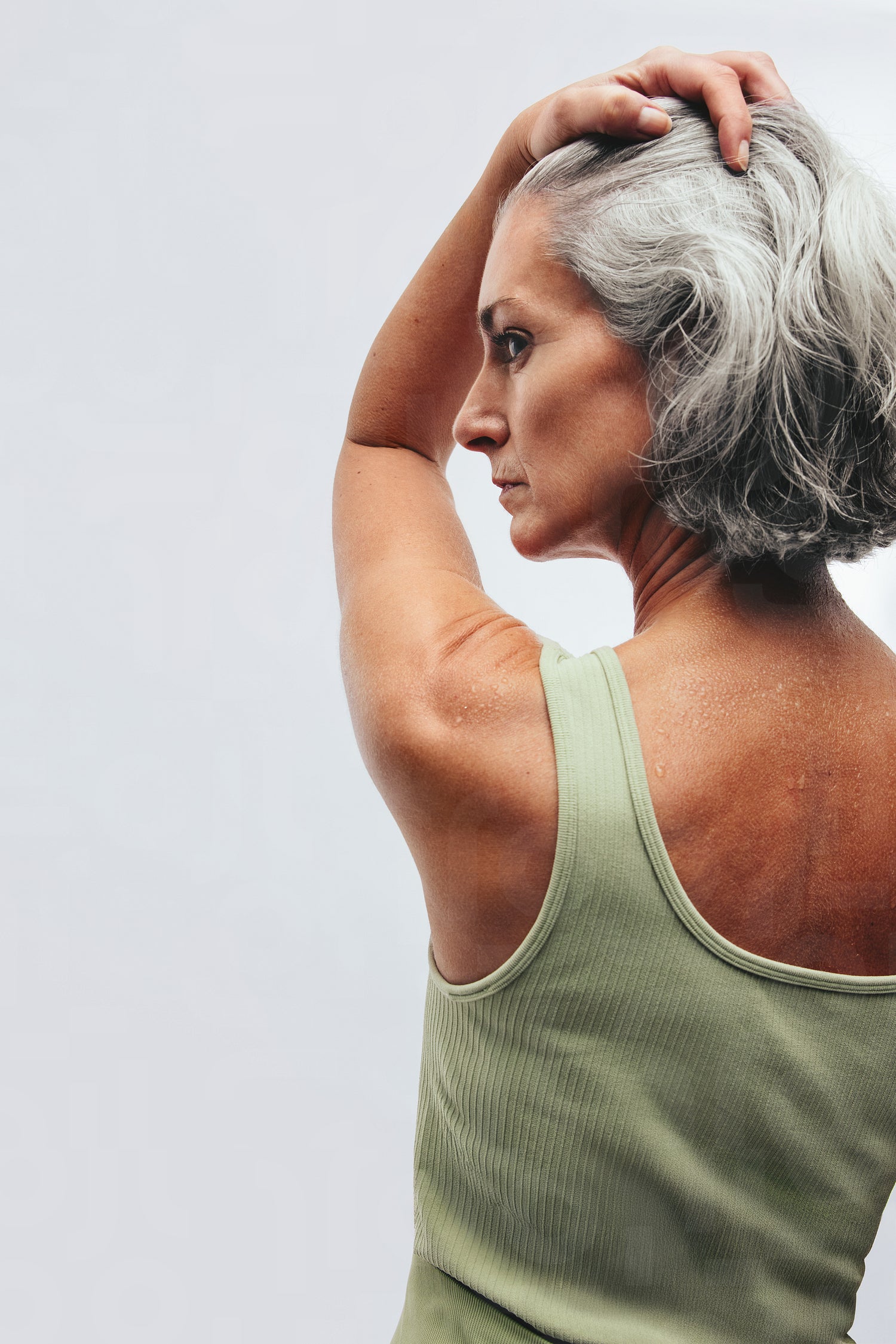 Mature woman in studio holding her hair back while stretching her arm and gazing thoughtfully. Portrait conveys strength, confidence, wellness and age positive beauty with natural texture and poise.