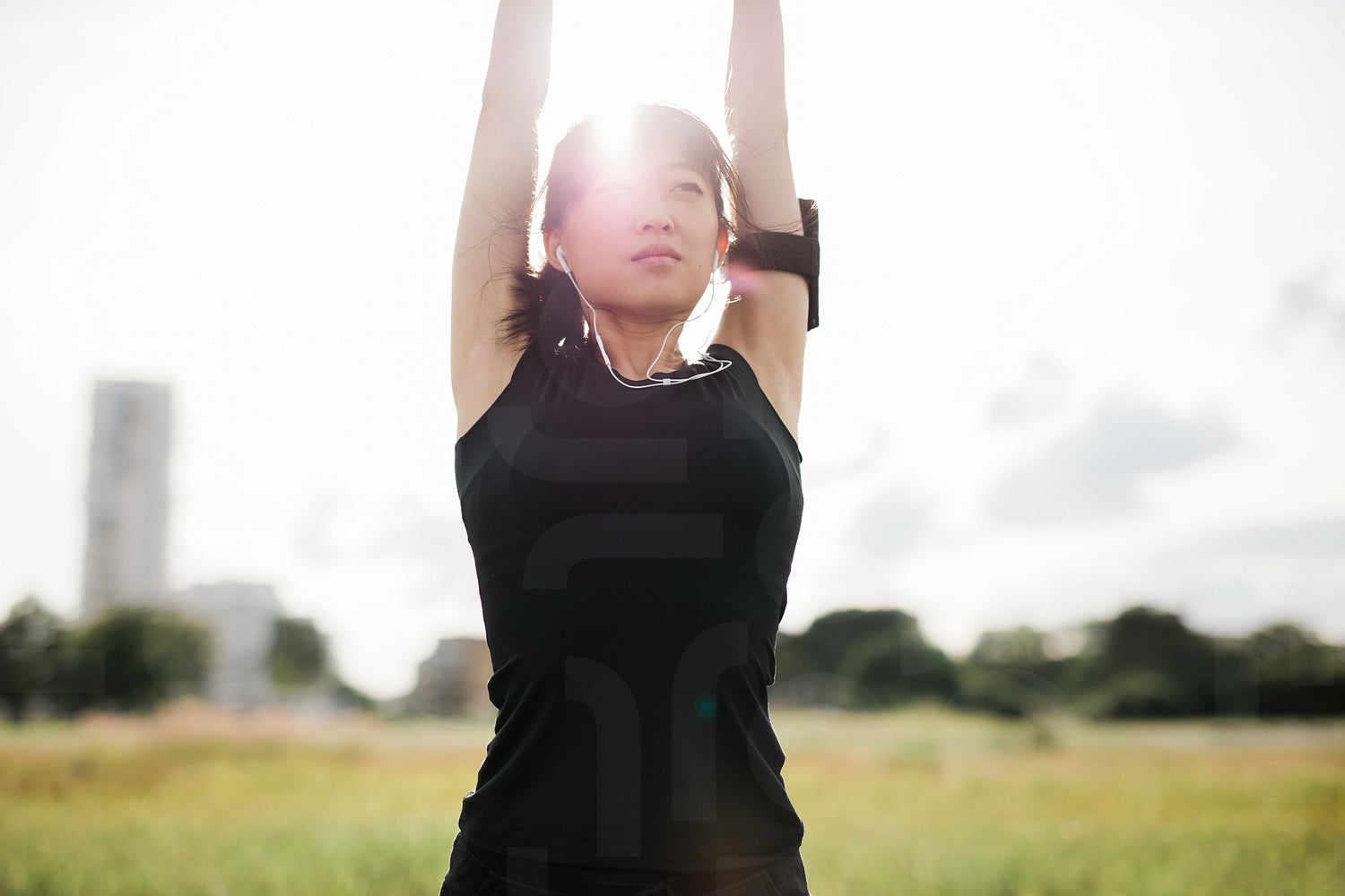 Shot of fitness female stretching hands at park. Chinese female model in sportswear exercising at a park in morning.