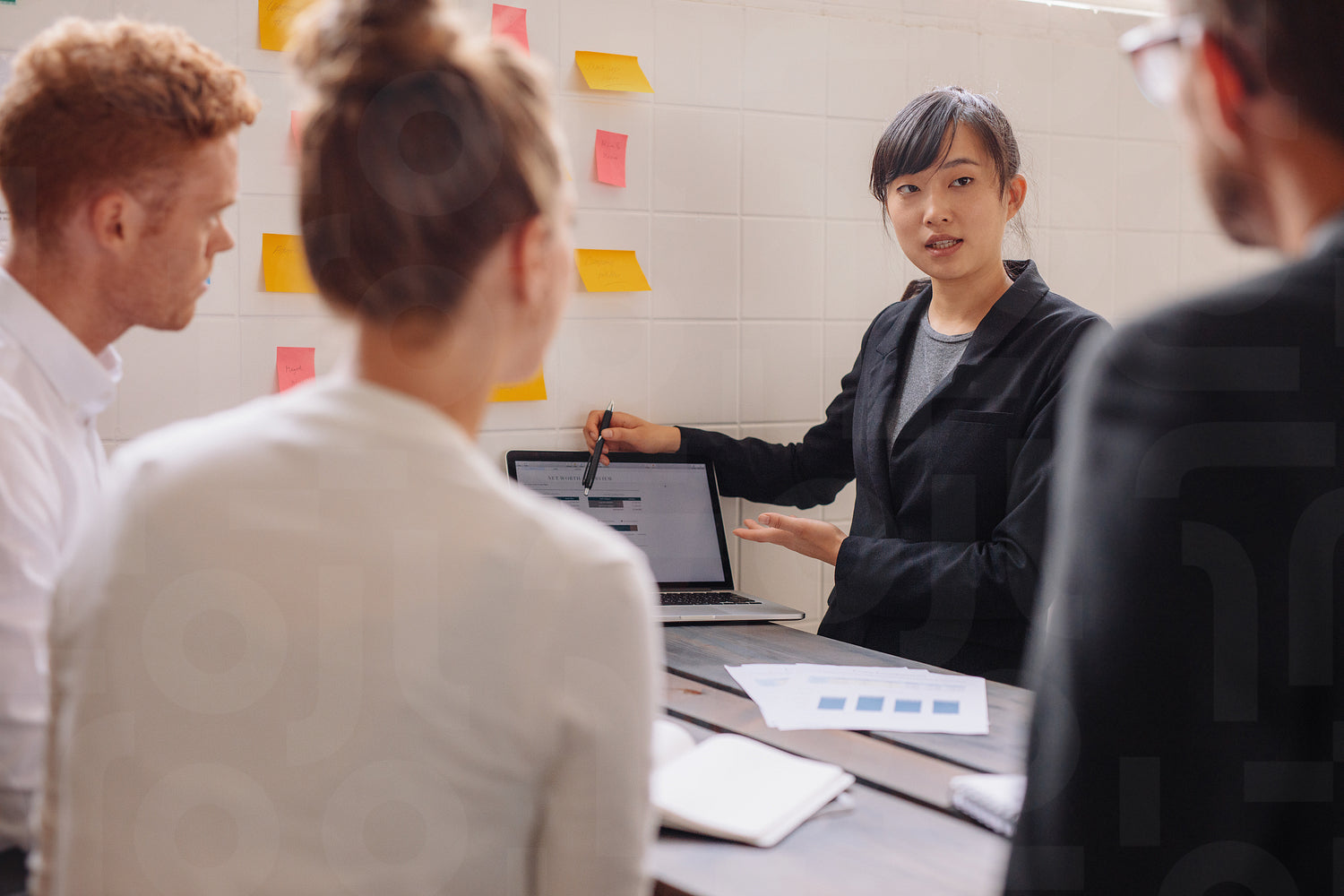 Group of business people discussing data on laptop at meeting in office. Businesswoman showing laptop and discussing with colleagues at conference table in office
