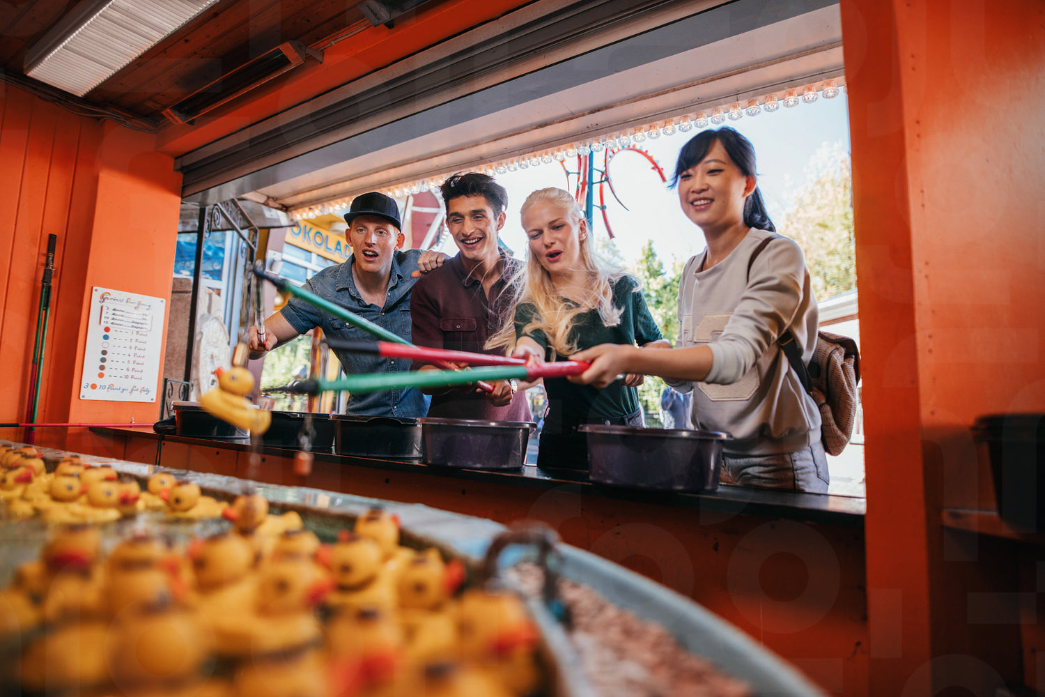 Happy young people having fun at amusement park playing fishing game. Group of friends playing fishing game at fairground.