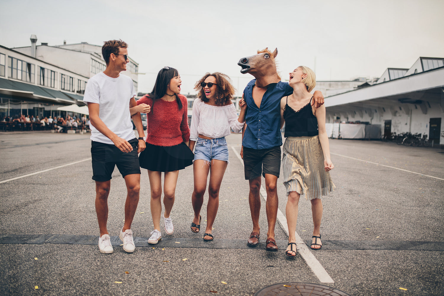 Full length shot of multiracial young friends having fun together on the street. Group of young men and women walking outdoors, with one man wearing horse mask.