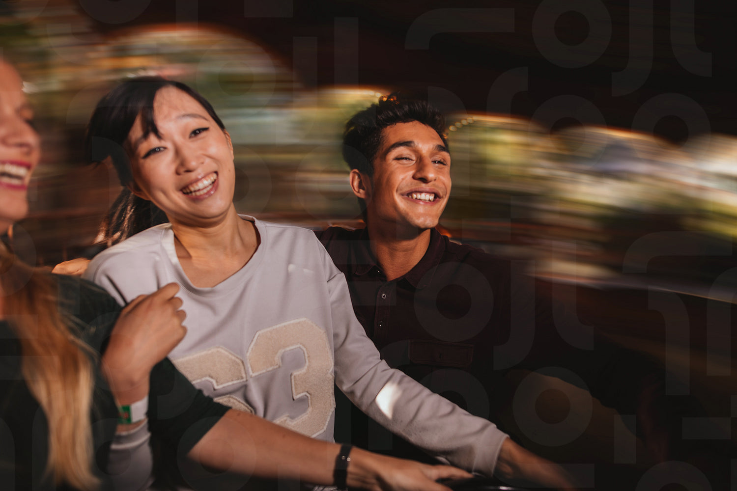 Three young people on amusement park ride. Group of friends having fun together in a ride.