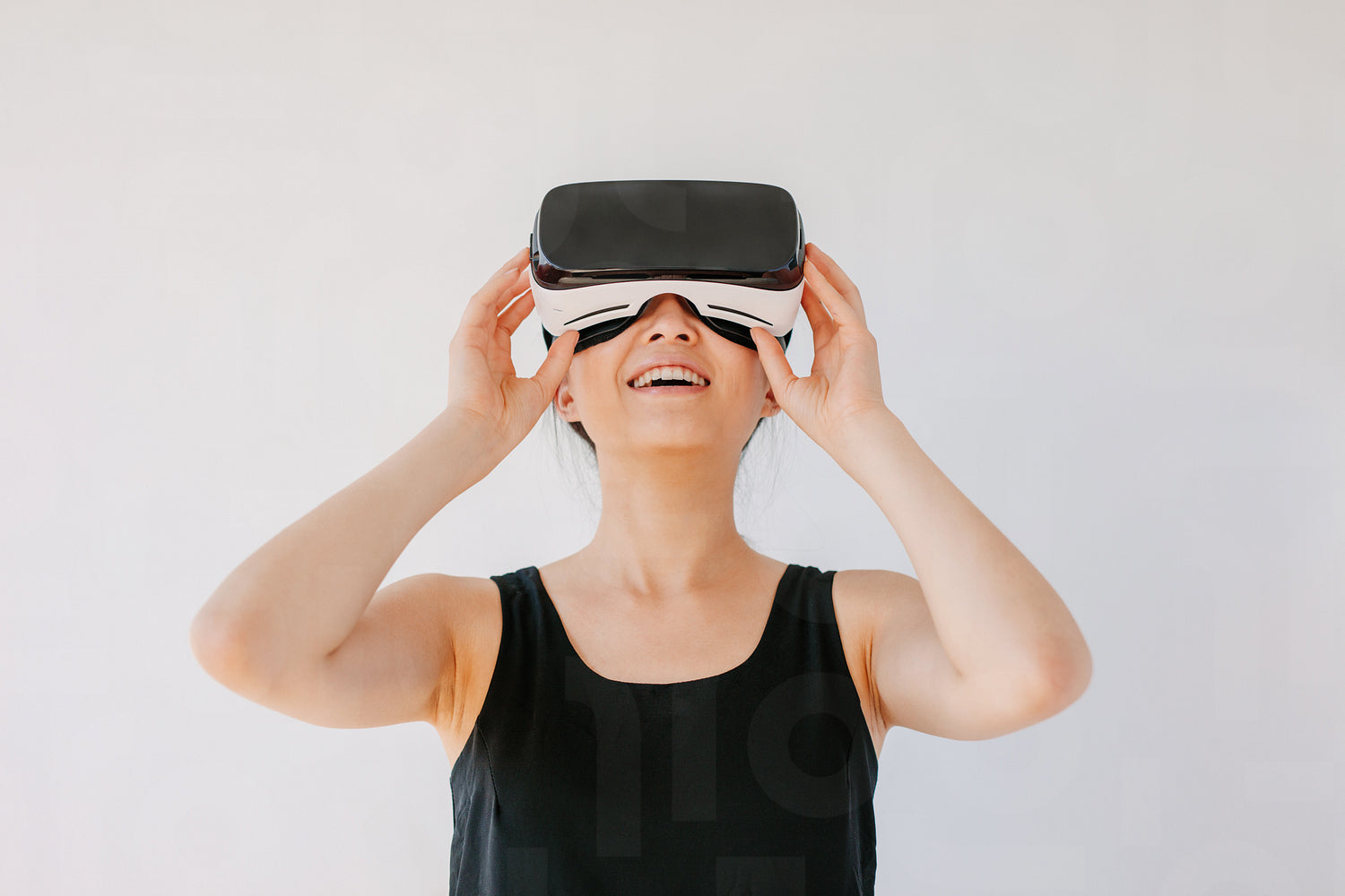 Shot of young woman using the virtual reality headset and smiling against grey background. Happy female model wearing VR goggles.