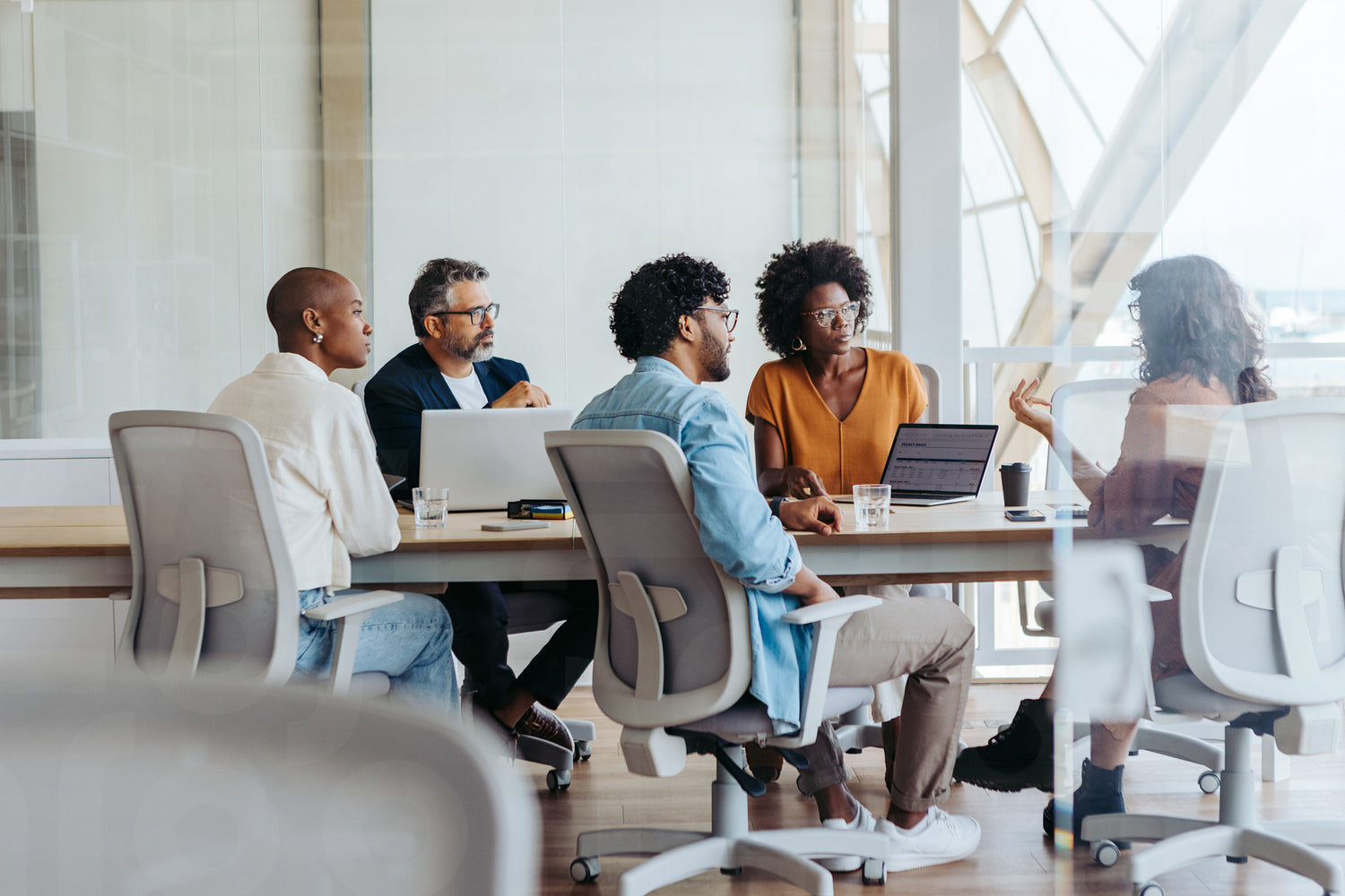 Creative business meeting of professionals brainstorming ideas in a collaborative boardroom